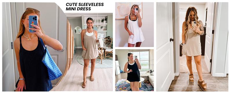 Feature: Scoop neckline, mini-length, two oversized patch pockets at front, thin shoulder straps, sleeveless mini dress for women with built-in shorts,solid color workout mini dress