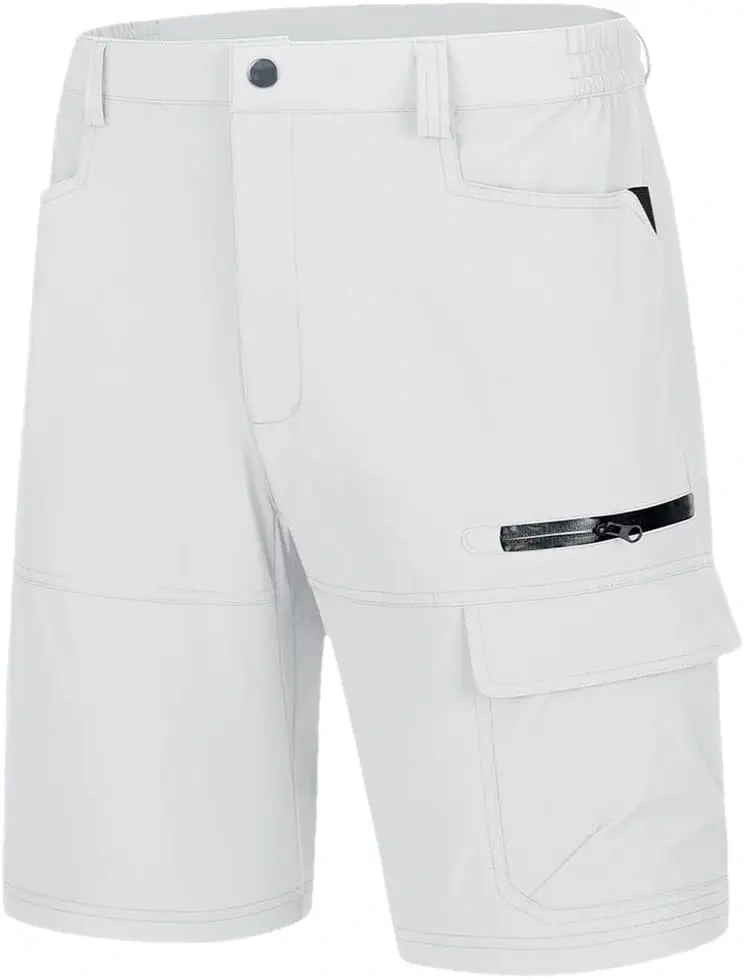 waterproofWaterproof: The Hiking Shorts are made ofwaterproof material, effectively repels stains and liquids5 Pockets: This men's quick dry short features 2 handpockets, 1 waterproof zipper pocket, 1 large cargo pocketat left thigh, 1 rear zipper pockets for the ultimateconvenience and efficiencyDesign: Men's cargo shorts features a partial elasticwaist, button closure with zip fly. Elastic waist with beltloop offer more flexible for a personalized fit.lts innerlength is 9 inches