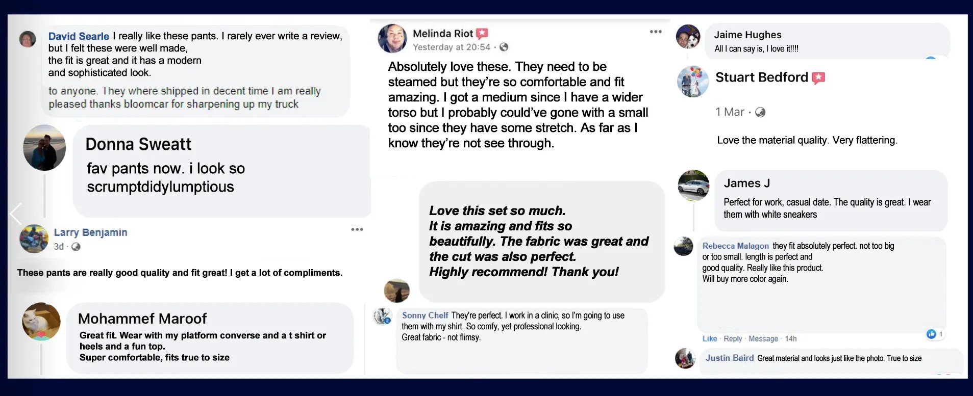 Made of a soft peacock slant fabric with a flattering drape and a little stretch throughout. They arrived to me nearly wrinkle-free and stayed that way.
